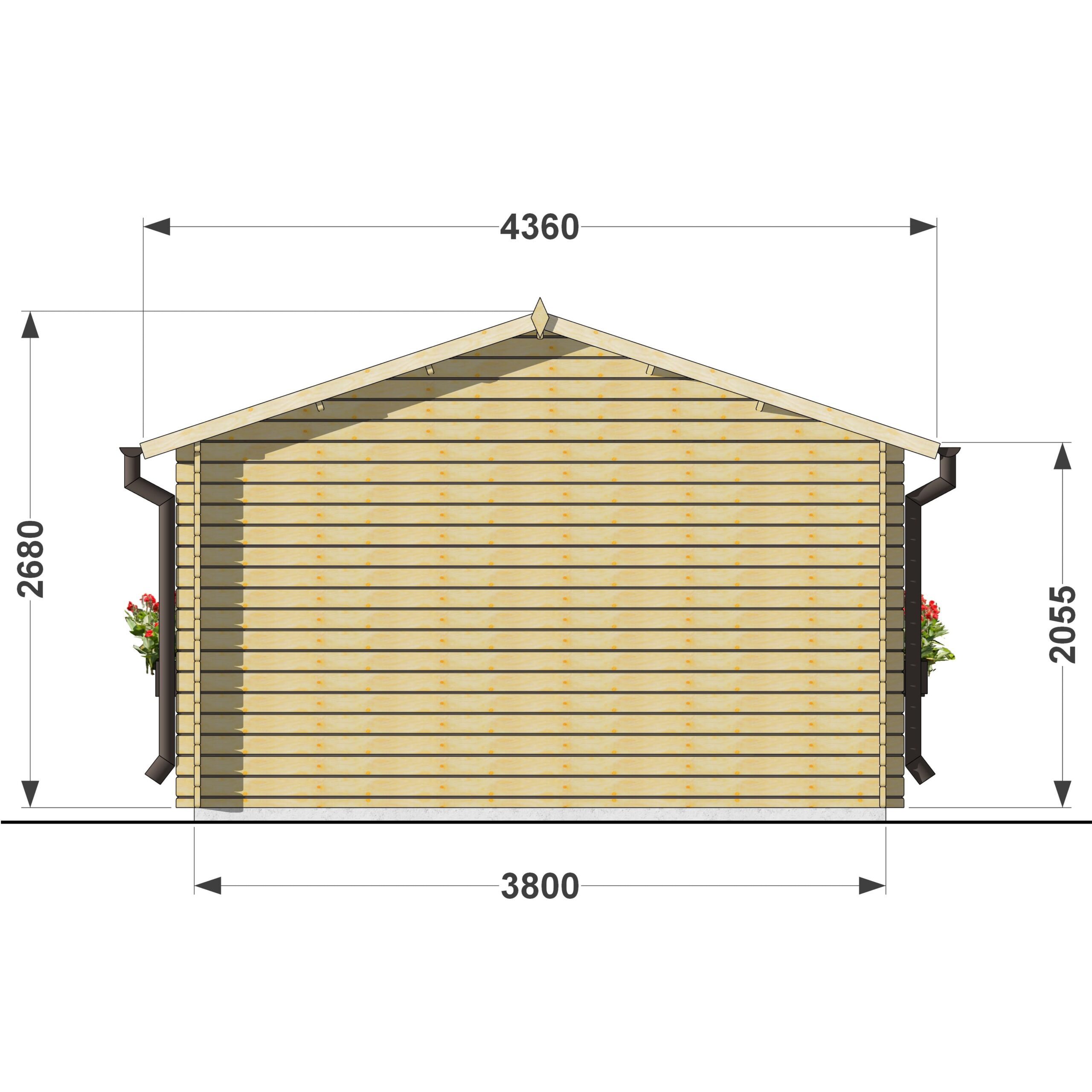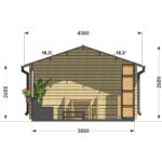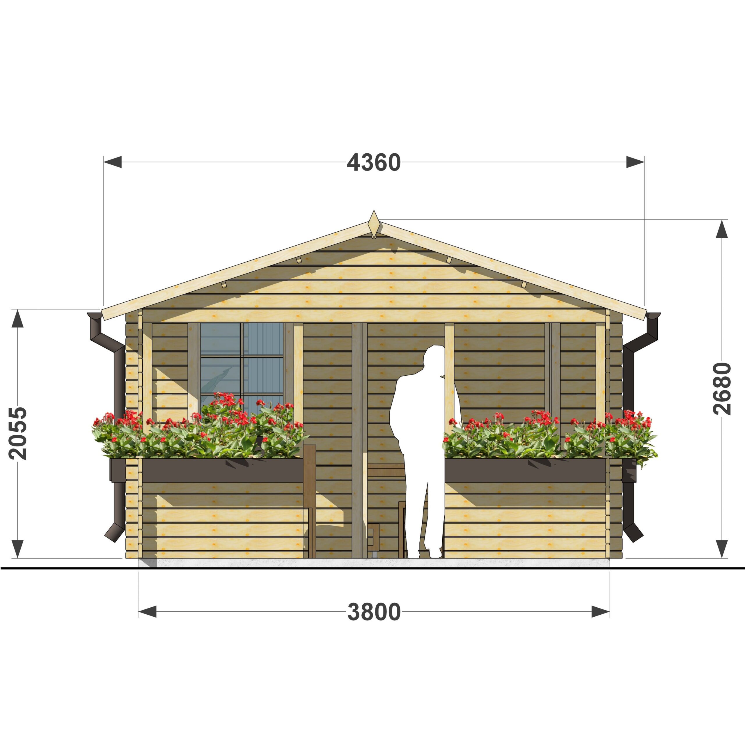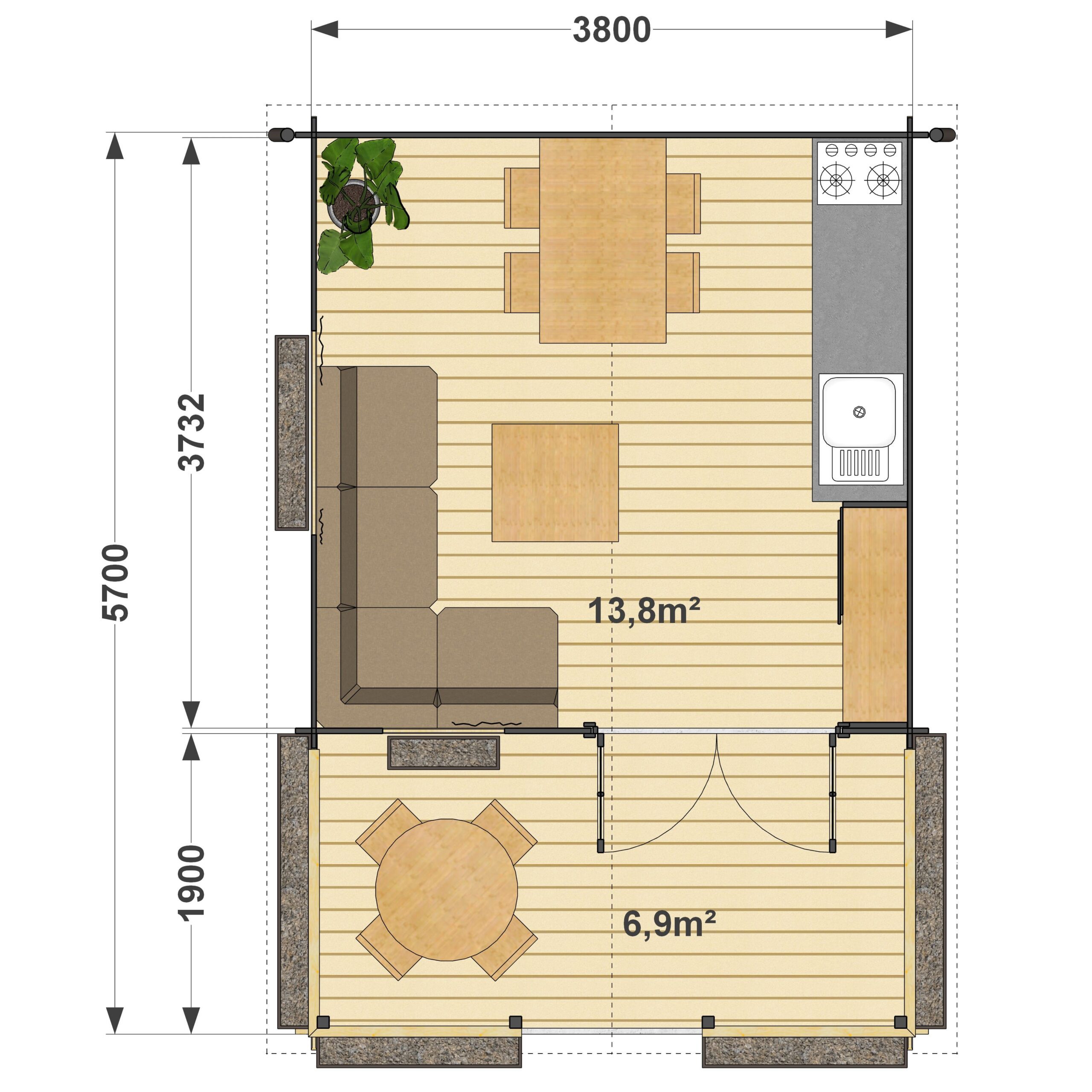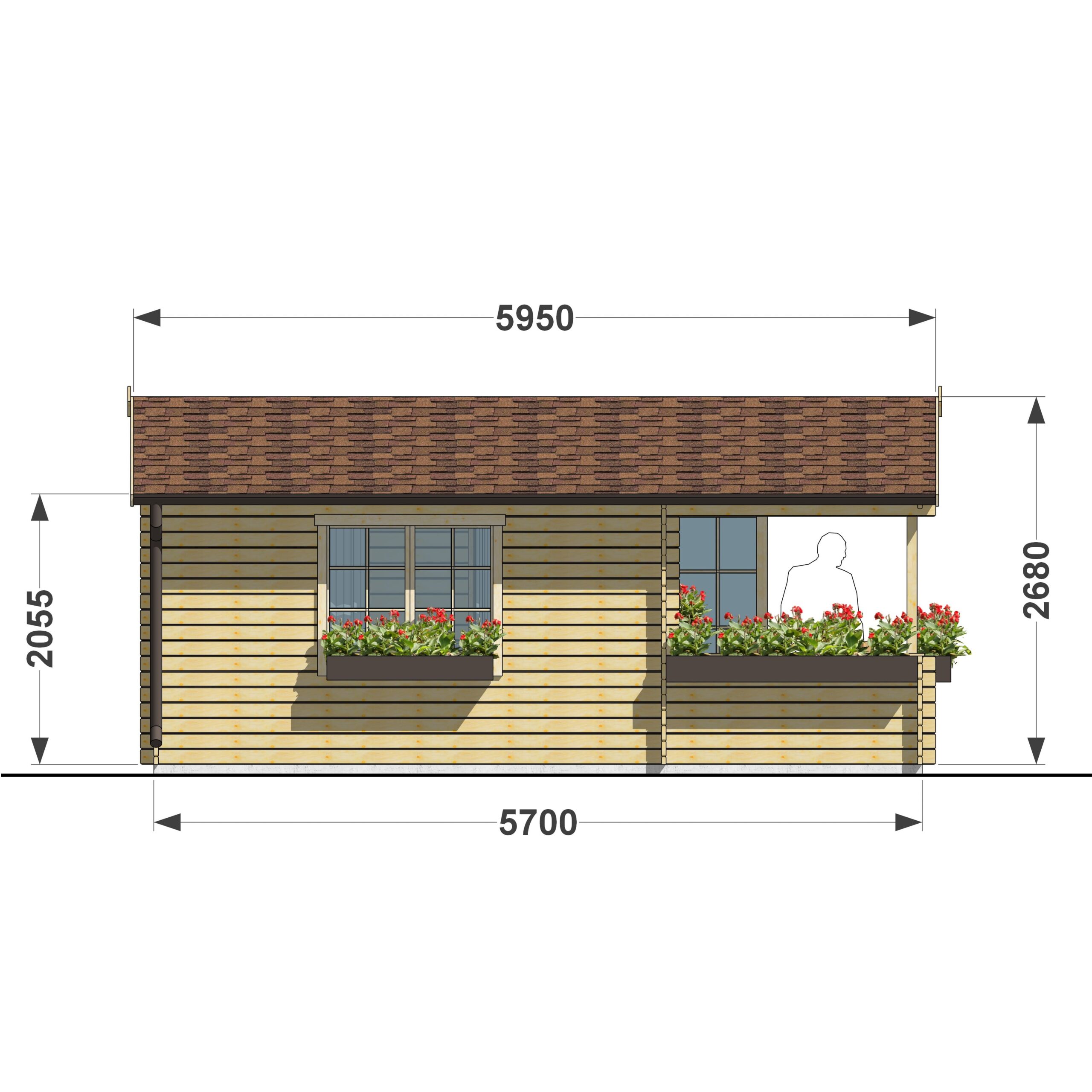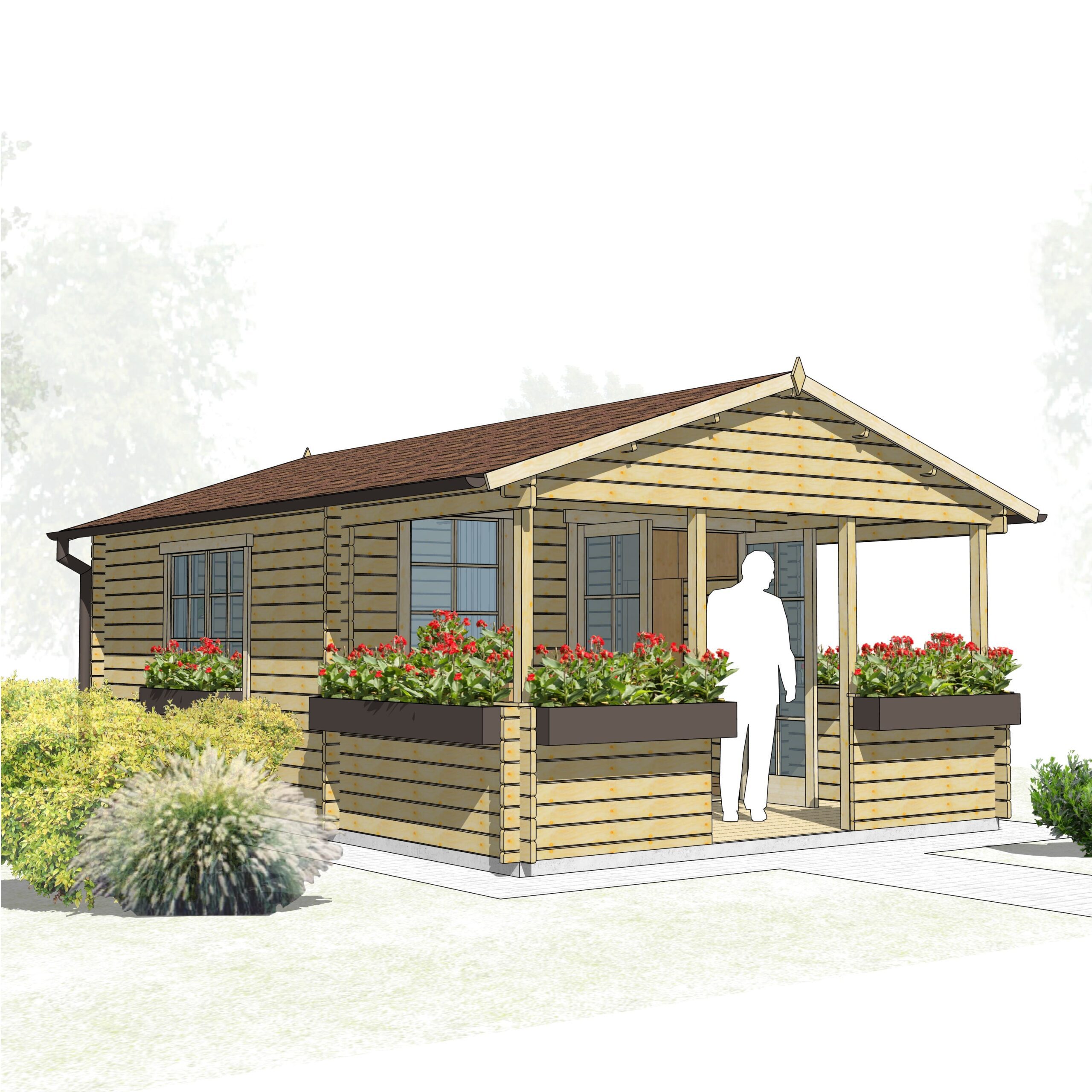 Drewniany domek letniskowy wyposażony jest w zadaszony taras o powierzchni 6,9 m², idealny na poranną kawę lub wieczorne spotkania na świeżym powietrzu. Dwuspadowy dach zapewnia niezawodną ochronę przed niepogodą, a liczne okna i przeszklone drzwi wypełniają wnętrze światłem i tworzą poczucie bliskości z naturą.