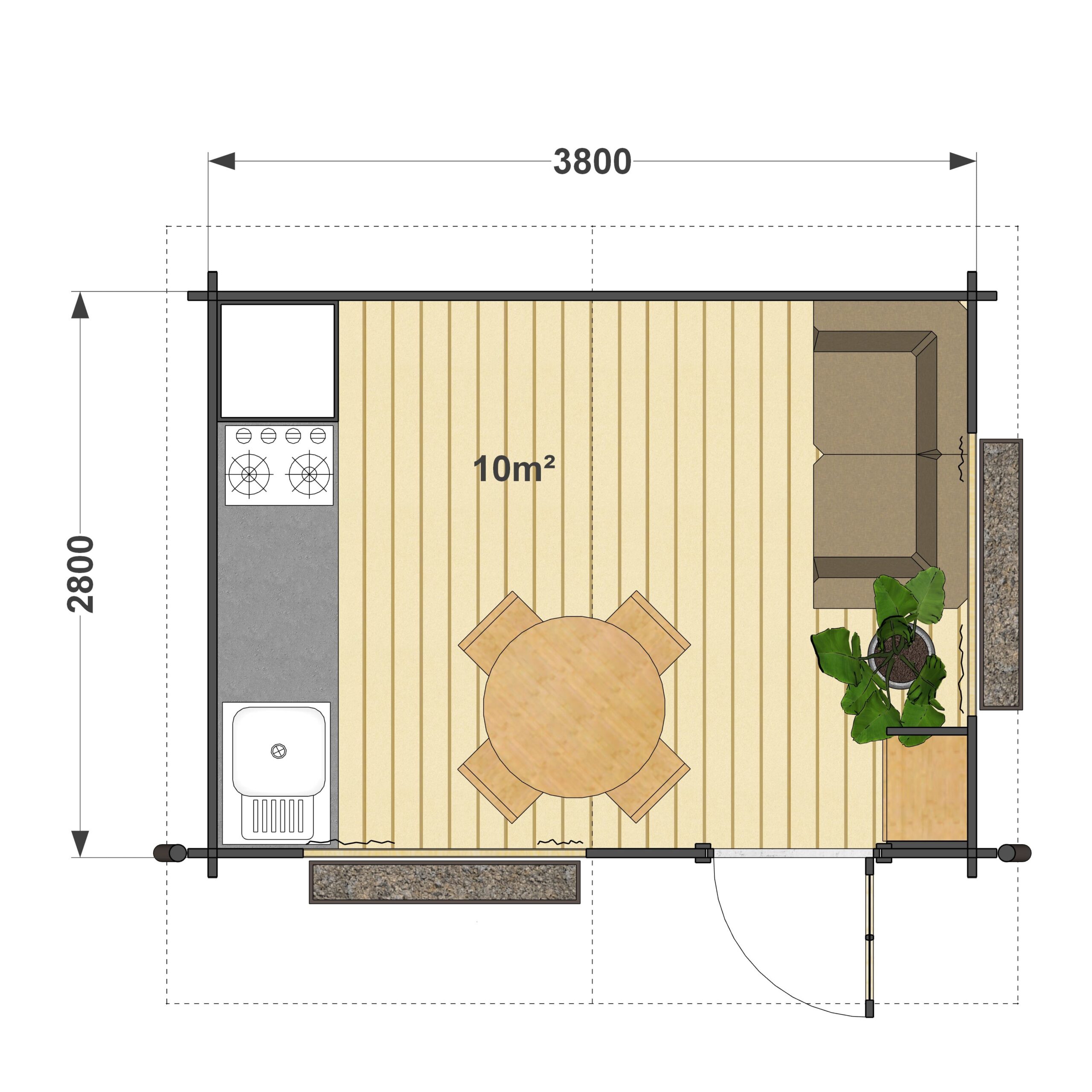 Przedstawiamy nasz kompaktowy i wielofunkcyjny domek Dreux 4×3. Powierzchnia zaledwie 10 m² sprawia, że doskonale nadaje się do stworzenia przytulnego zakątka na łonie natury lub w ogrodzie. Pomimo niewielkich rozmiarów oferuje wiele możliwości aranżacyjnych:
