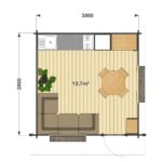 Domek składa się z jednego pomieszczenia, które można łatwo podzielić na strefy według własnego uznania. Zmieści się tu mała kuchnia ze stołem jadalnym, kącik do wypoczynku oraz szafa na rzeczy.