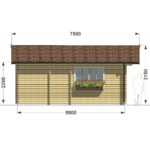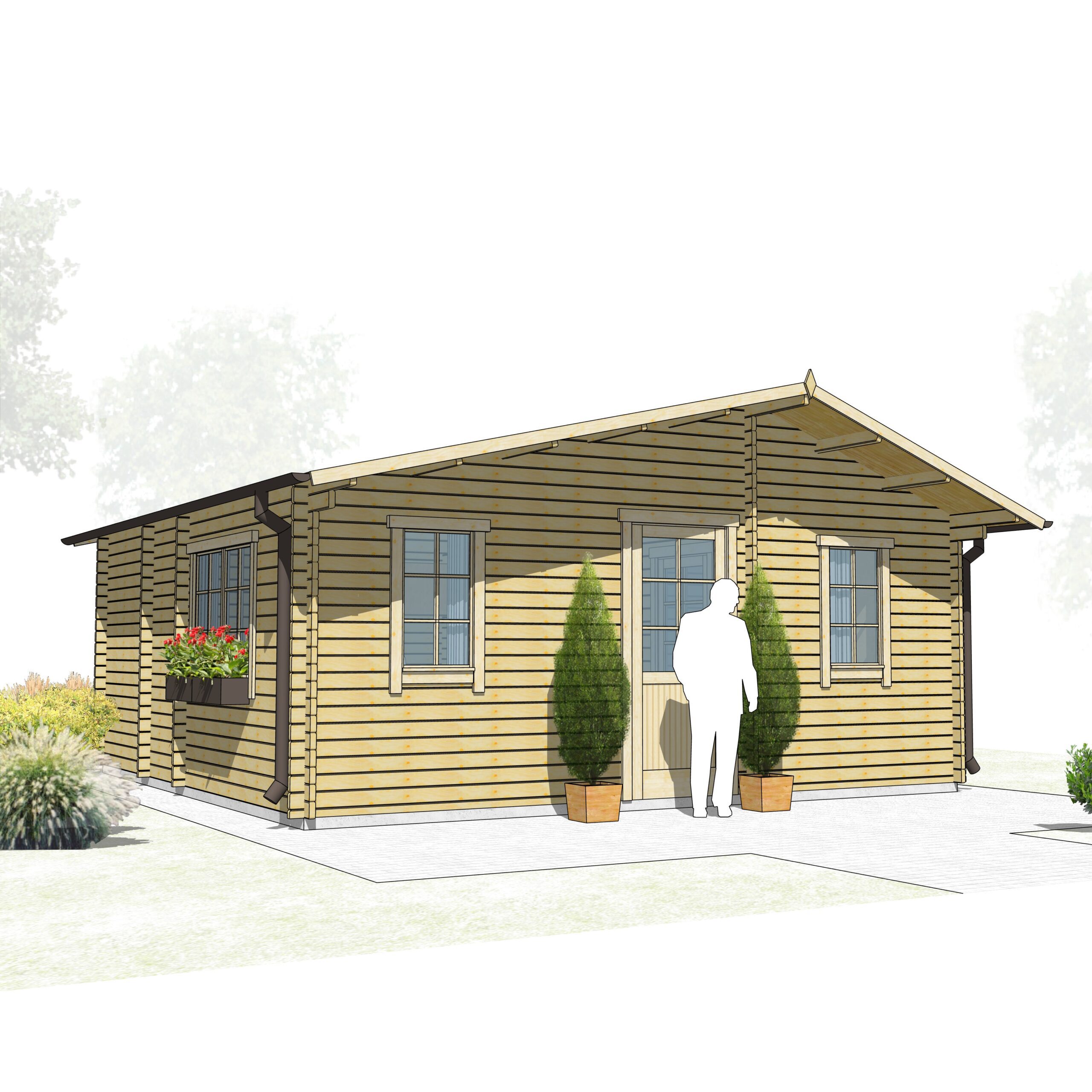 Drewniany dom posiada drzwi z przeszkleniem oraz wiele okien, przez które wpada naturalne światło. Przestronny dach ochroni Cię przed deszczem i słońcem, pozwalając cieszyć się filiżanką ulubionego napoju, podziwiając przyrodę.