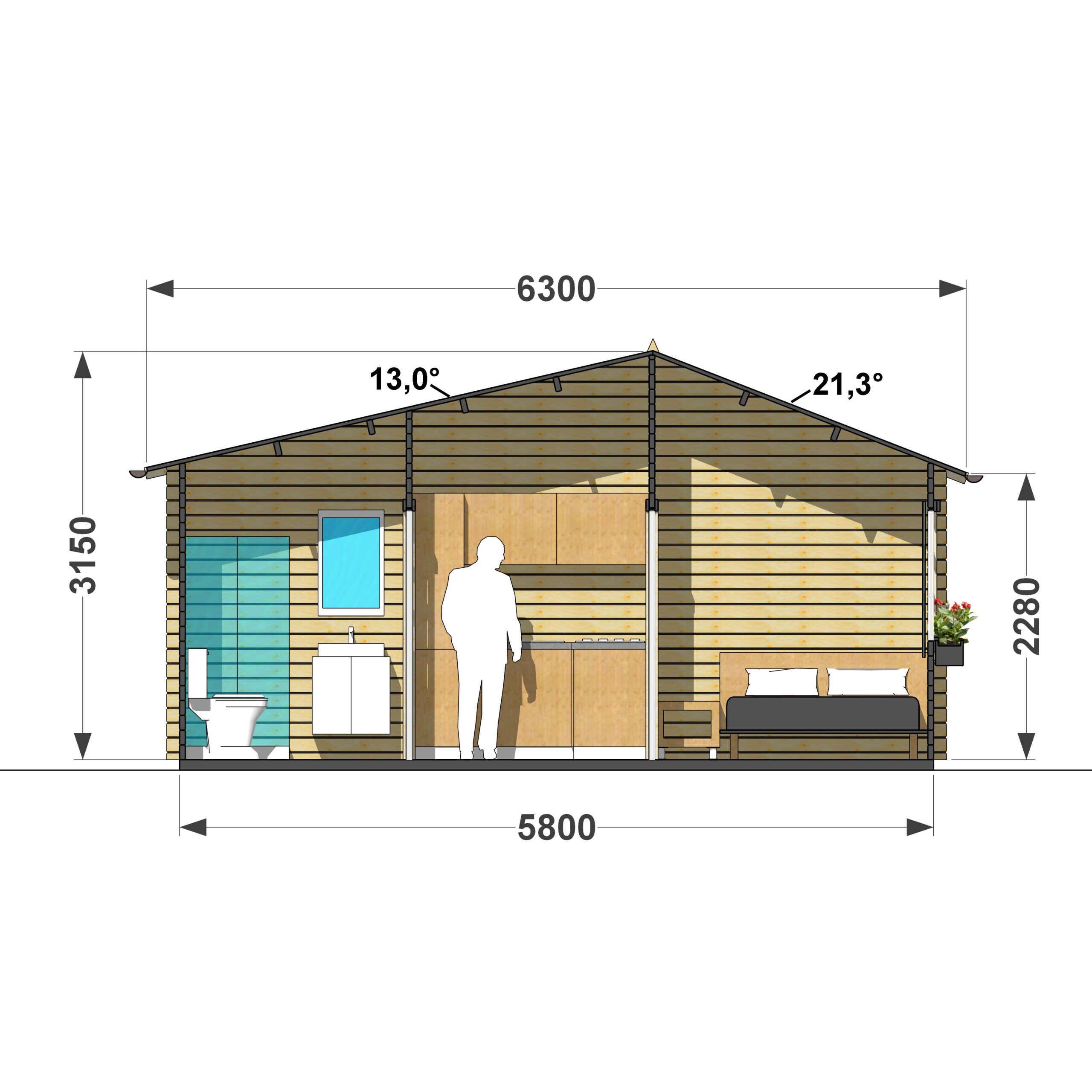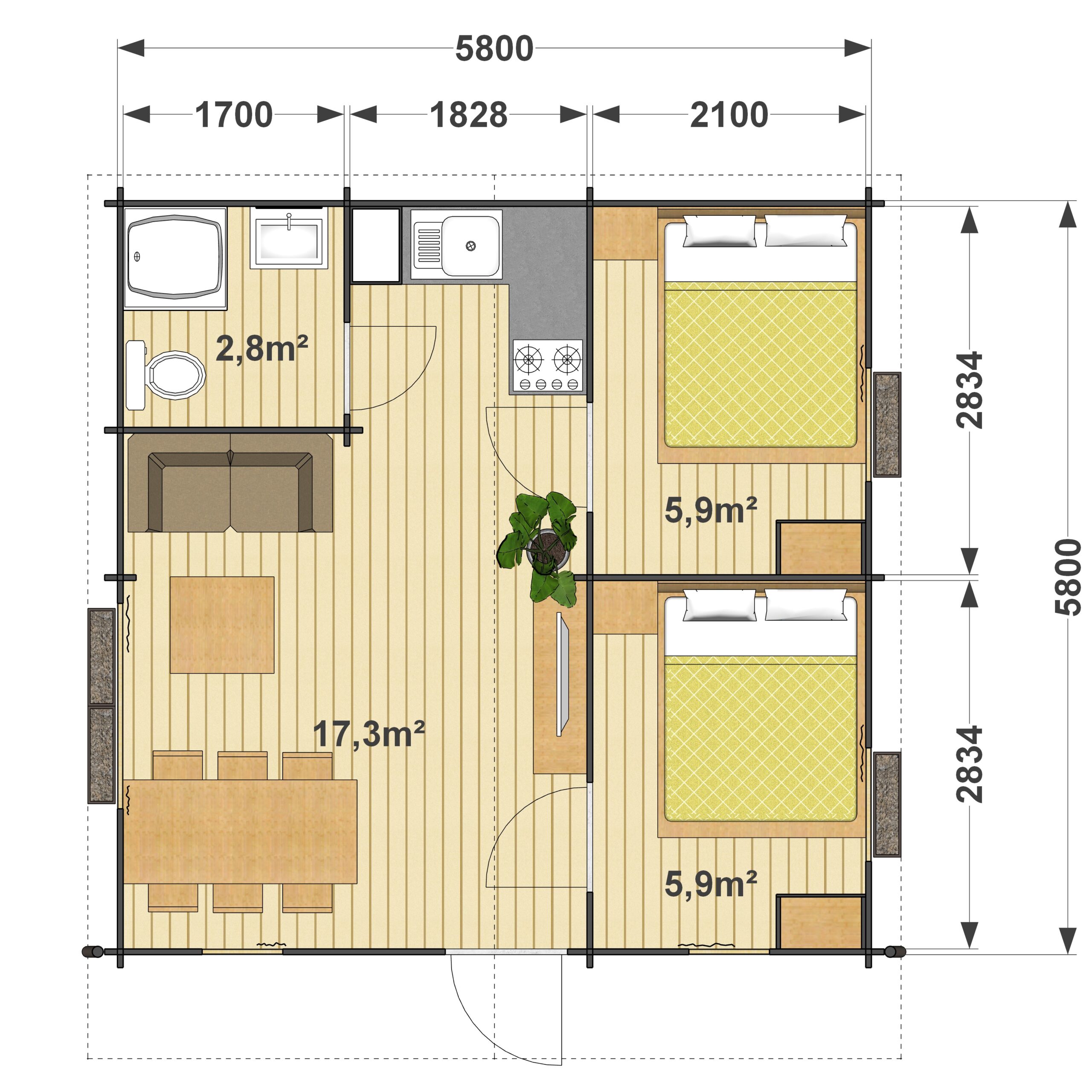W domu przewidziano dwie sypialnie o powierzchni 5,9 m². Doskonale nadają się do stworzenia komfortowych sypialni. Łazienka o powierzchni 2,9 m² pomieści kabinę prysznicową, umywalkę i toaletę, co sprawi, że życie na łonie natury stanie się wygodne.