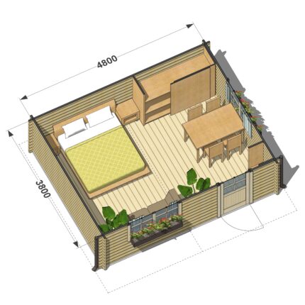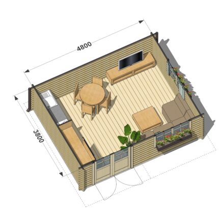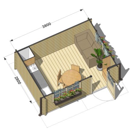 Niewielki domek ogrodowy z balików Oak o powierzchni 15,4 m² doskonale nadaje się na małą działkę. Wewnątrz czeka na Ciebie: