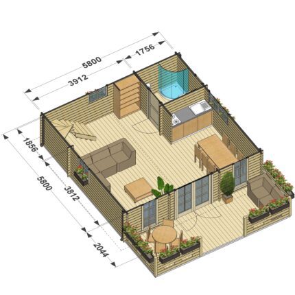 Rozmiar zewnętrzny (m) 5,8×8 Grubość balika (mm) 44 Powierzchnia zabudowy (m2) 45.2 Powierzchnia domku użytkowa (m2) 31,9+taras 11.1m2 Powierzchnia podłogi