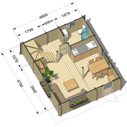 Rozmiar zewnętrzny (m) 5700×4800 Grubość balika (mm) 45 mm Powierzchnia zabudowy (m2) 27.3 Powierzchnia domku użytkowa (m2)  20.2 + taras